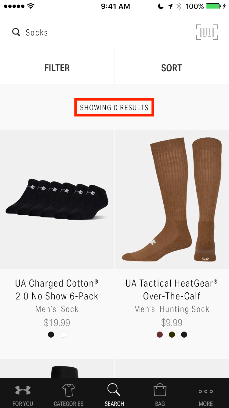 And there we go! The UI element now says SHOWING 0 RESULTS because we passed in “129” as a string and not an integer. This tells us that the mobile app only supports this value coming back as an integer.