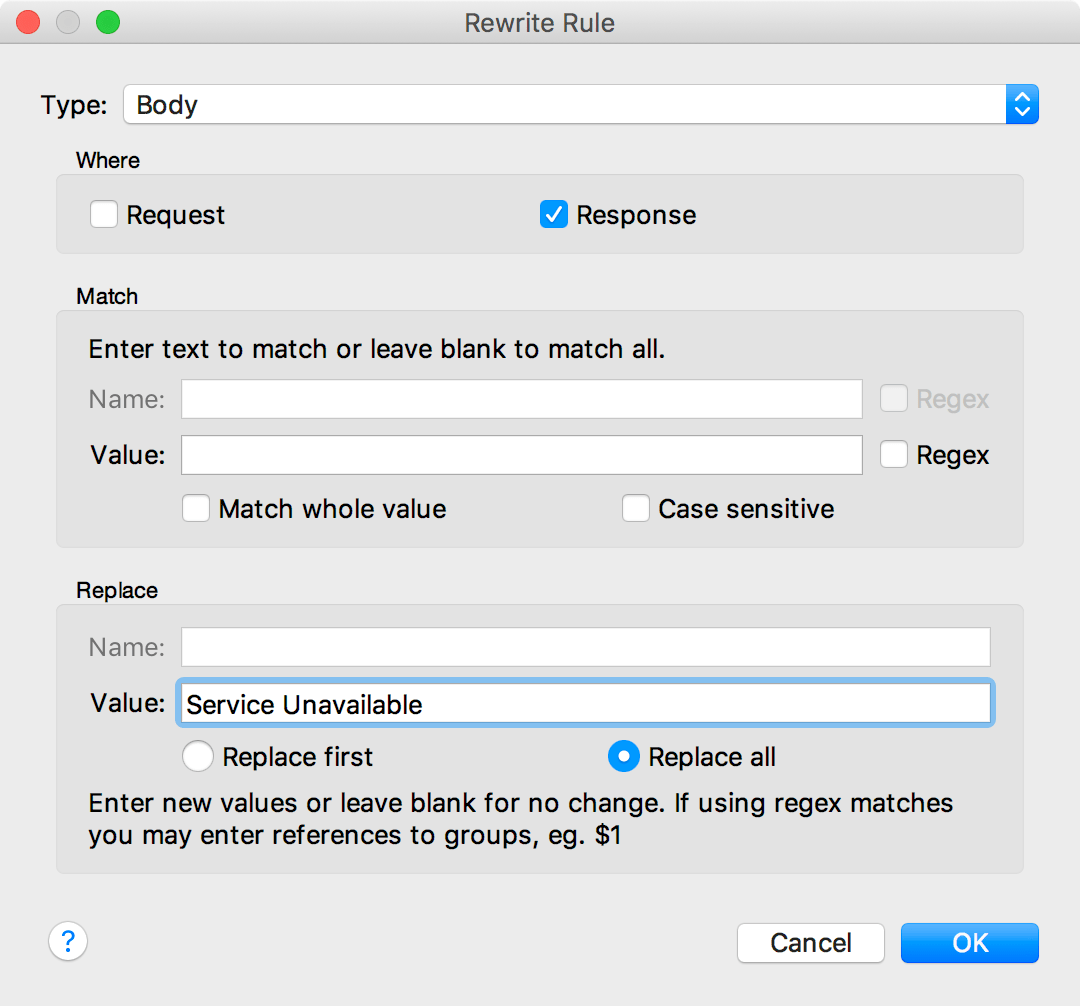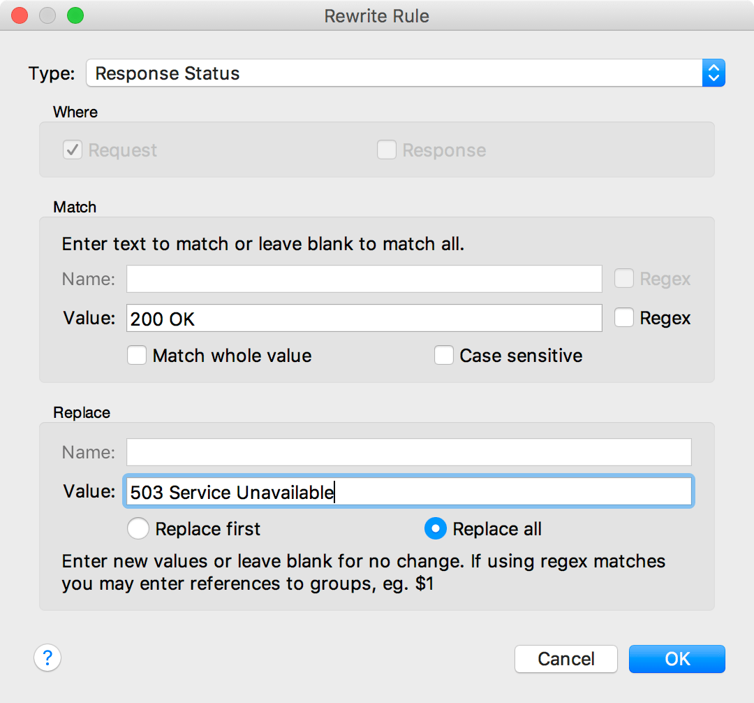 For now, let’s just chose a Type of Response Status. Then, in the Match section Value field, we’ll enter “200 OK” (without quotes), in the Replace section Value field, we’ll enter “503 Service Unavailable”, and finally select Replace All.