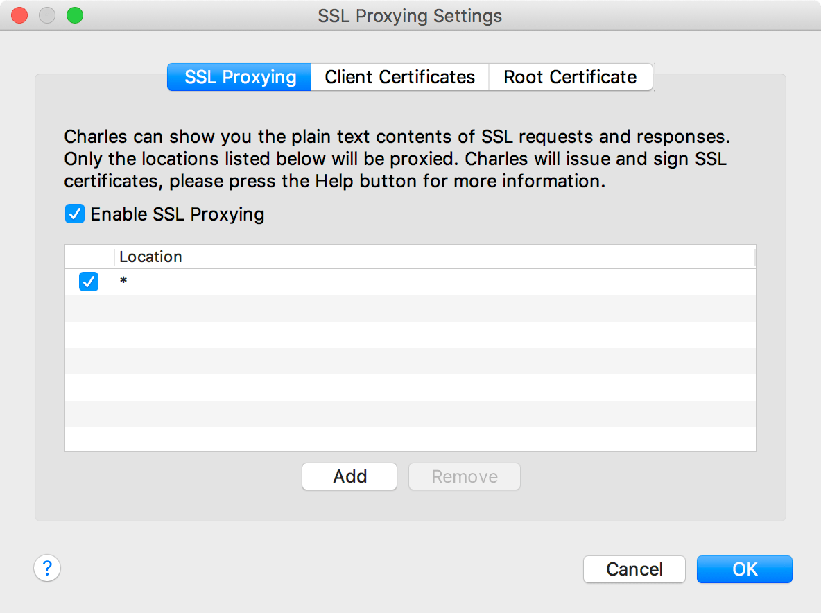 We’ll choose to enable SSL Proxying for all locations by clicking Add, entering a single wildcard character ( * ) in the Host field, leaving Port empty, and then clicking OK. When finished, our SSL Proxying Settings should look like this: