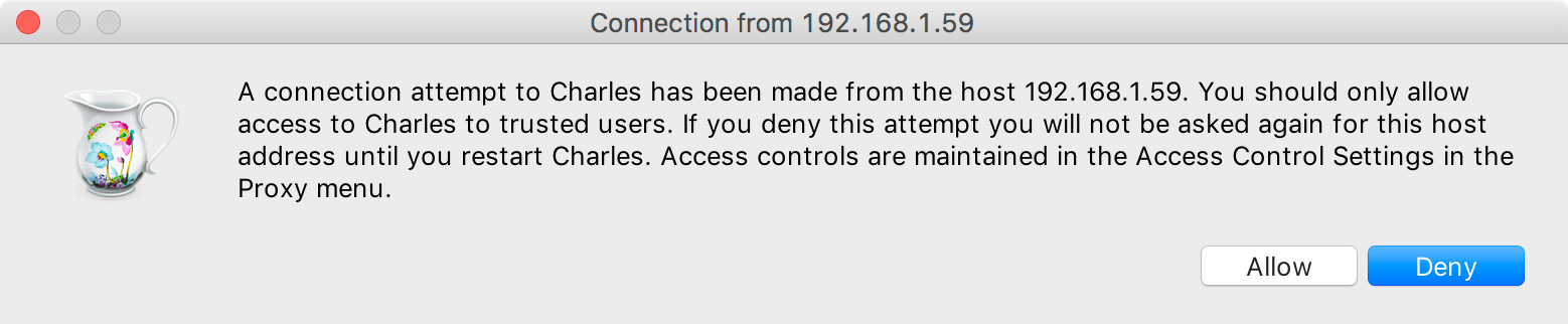 This is to allow the device permission to utilize Charles on our computer as a proxy. Click Allow.