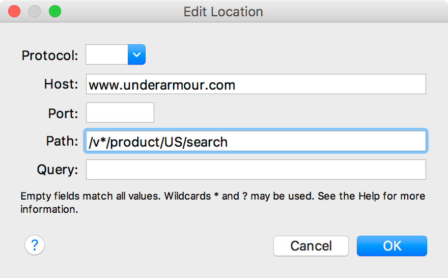• Wildcards ( * ) are also supported here and in many other tools in Charles. For instance, if Under Armour were to come out with version v1.0 of this service, and we were testing multiple versions of the app (some using v0.0 and some v1.0) but didn’t want to create multiple breakpoints, we could enter a Path of /v*/product/US/search and the breakpoint would apply regardless of whether v0.0 or v1.0 was called.