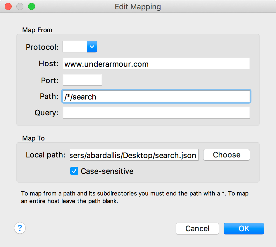 Navigate to Tools > Map Local… and select the checkbox to Enable Map Local. Click Add and once again, enter the correct Host and Path, and the correct Protocol, Port and Query if necessary. Next to the Local path field, click Choose and select the search.json file you just created.