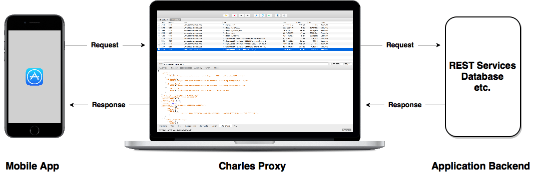 Let’s make sure we’ve got a basic mental model of the flow that takes place when we’re proxying through Charles. The request will be triggered by some event or action that we initiate in the mobile app, sent through Charles as our proxy, and received by the backend. It is then processed by the backend services where a response is created. That response is finally sent back to the app passing through Charles along the way.