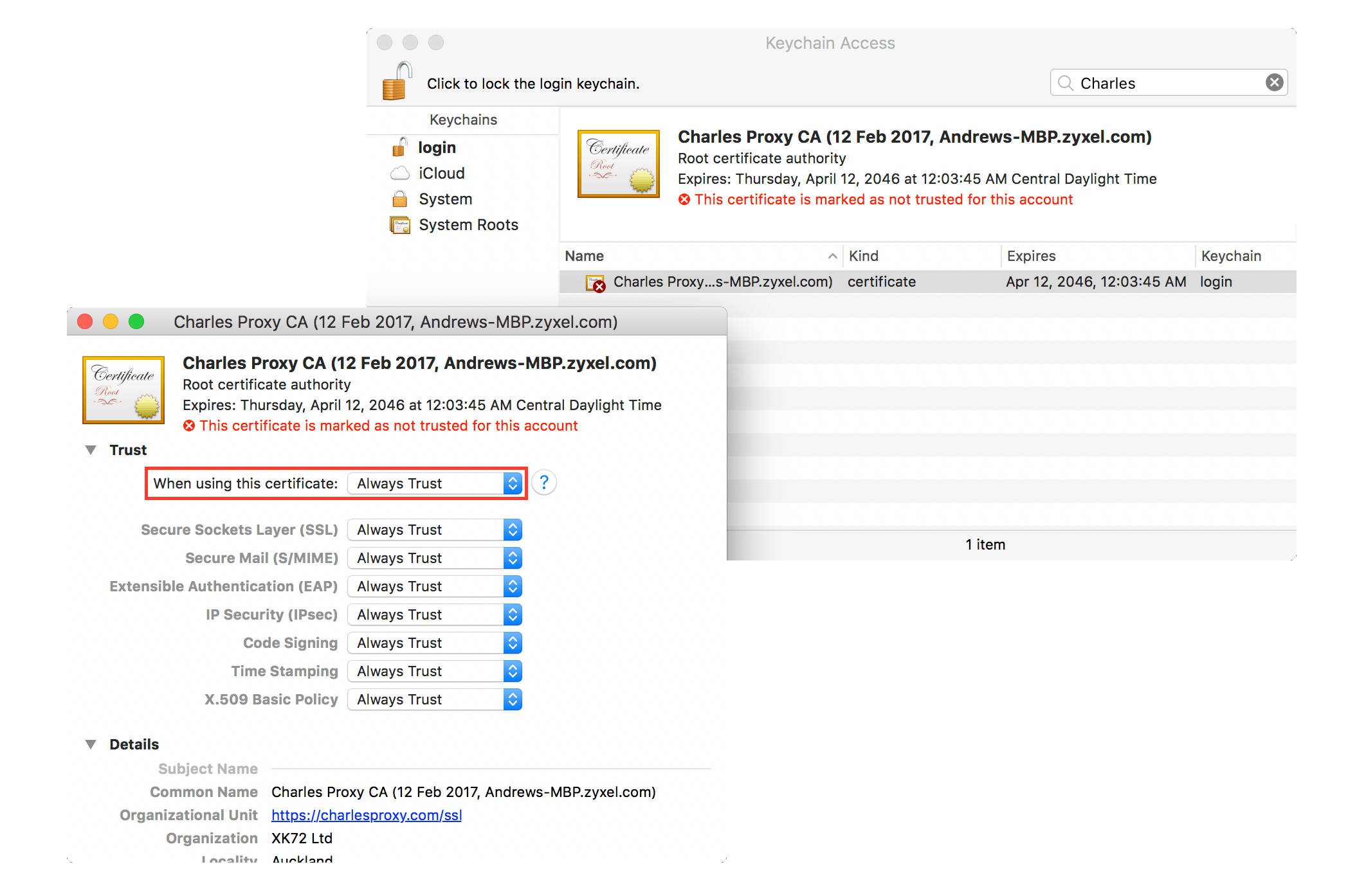 Double click the name of the Charles certificate to open the certificate details window. Expand the Trust section and select Always Trust from the When using this certificate: drop-down list. Close the certificate details window and enter your password once again to confirm your changes. You should now see that the Charles certificate is marked as trusted.